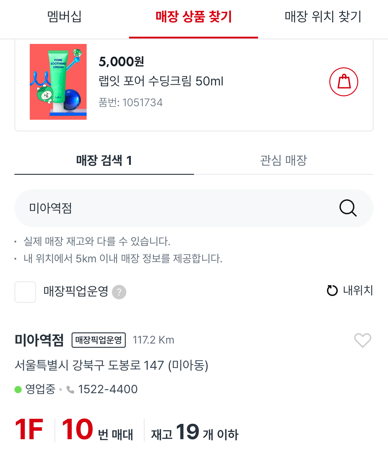 5. 재고 확인 - 재고가 있는 경우 상품이 진열된 기둥렬 번호도 함께 확인할 수 있습니다.